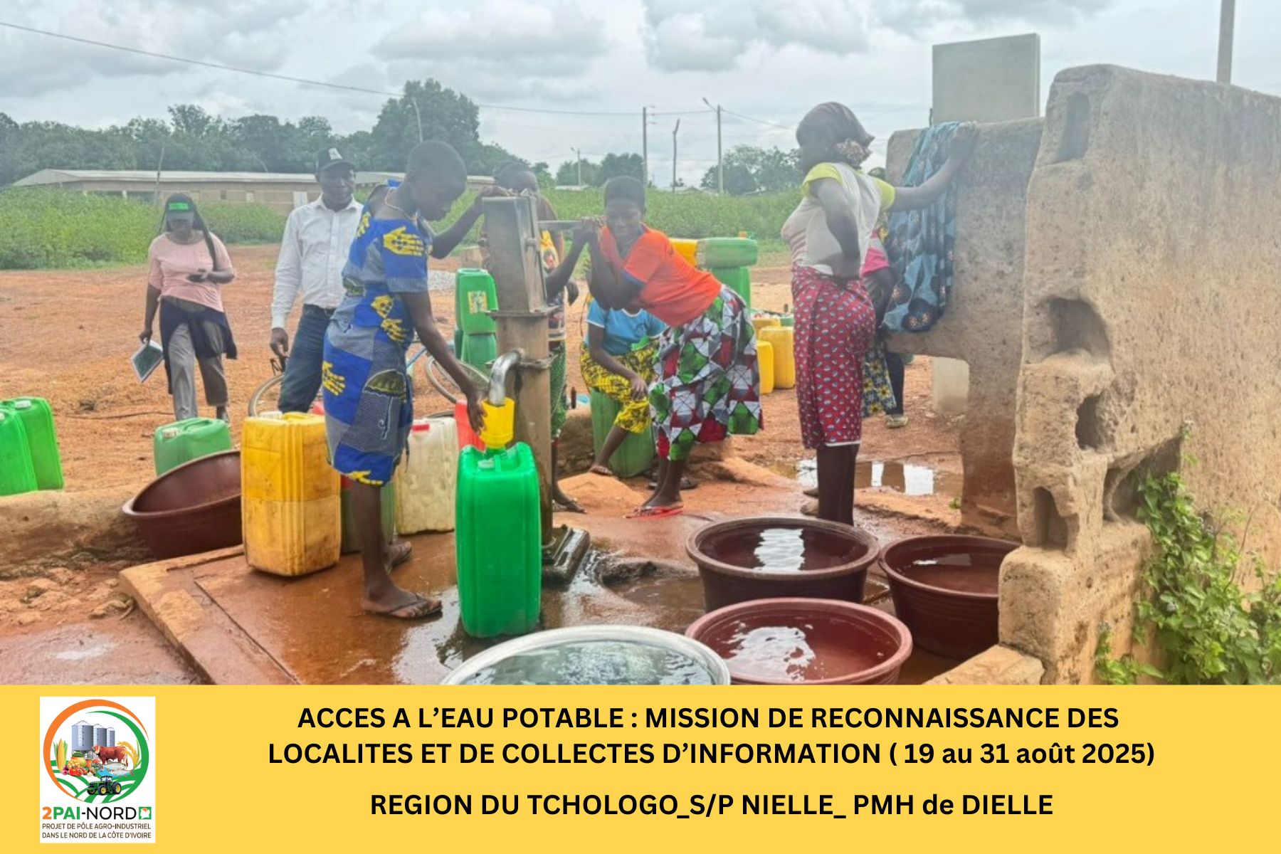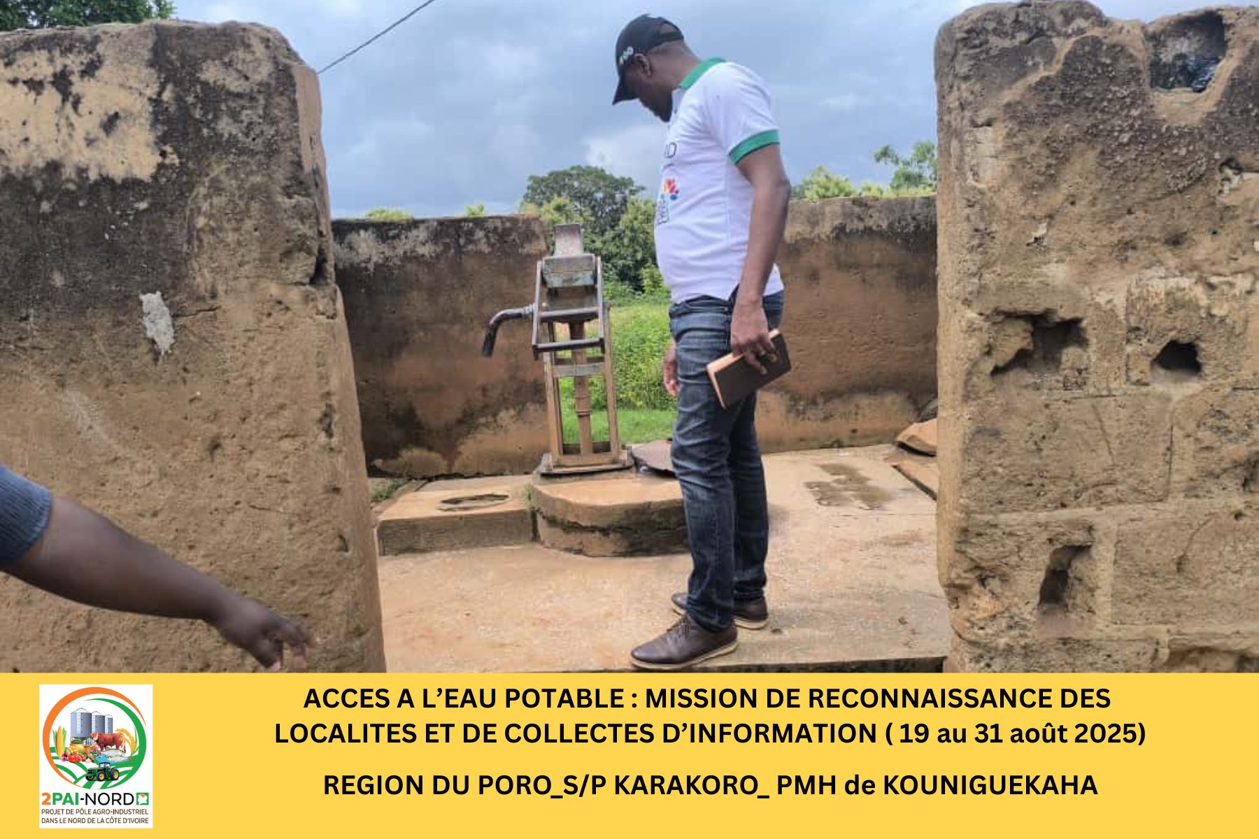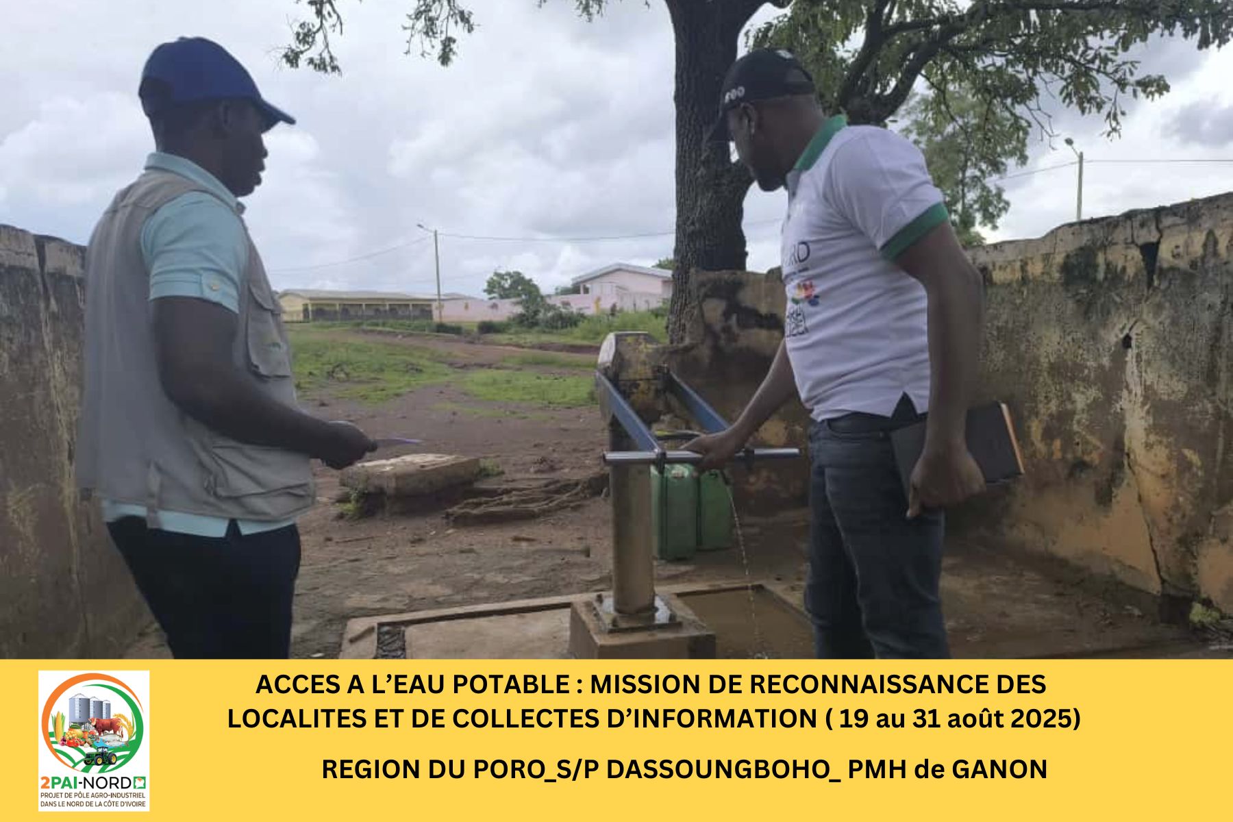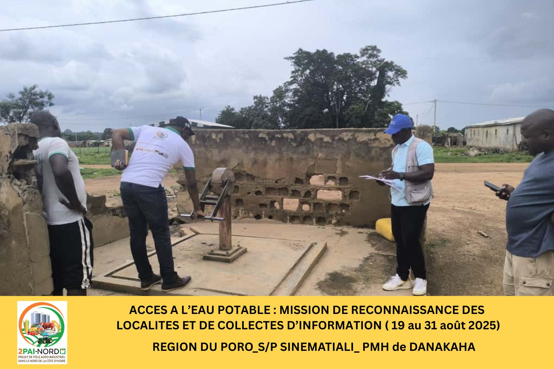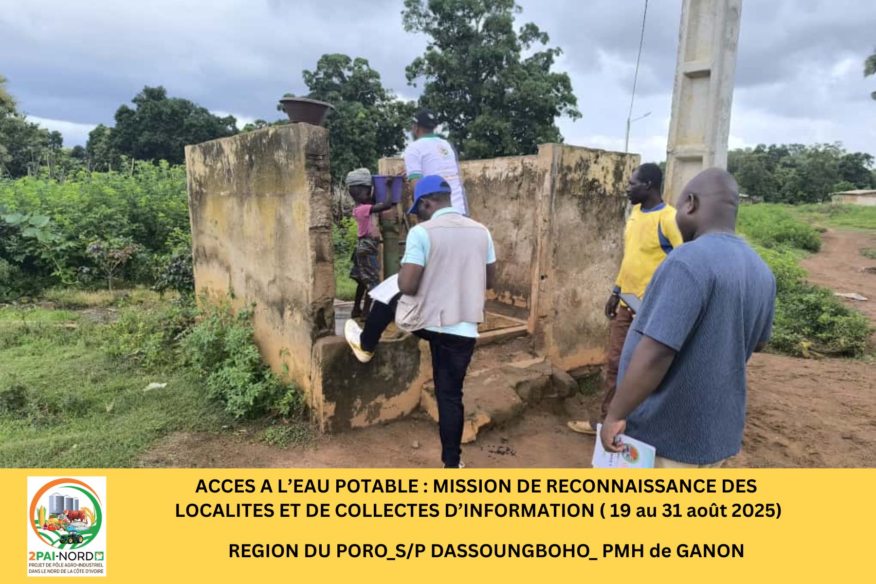 C’est dans cette perspective qu’une mission conjointe du Projet de Pôle Agro-Industriel dans le Nord (2PAI-NORD)et de l’Office National de l’Eau Potable (ONEP), conduite par Monsieur DIBI Hyacinthe, Ingénieur en Génie Civil, s’est déroulée du 19 au 31 août 2025. Cette mission a couvert cinquante-deux (52) localités de la zone d’intervention du Projet. Elle avait pour objectif de diagnostiquer la situation de l’accès à l’eau potable dans les localités présélectionnées et de préparer les études de faisabilité technique (Avant-Projet Sommaire/ Avant-Projet Détaillé), étape préalable à la réalisation des infrastructures.