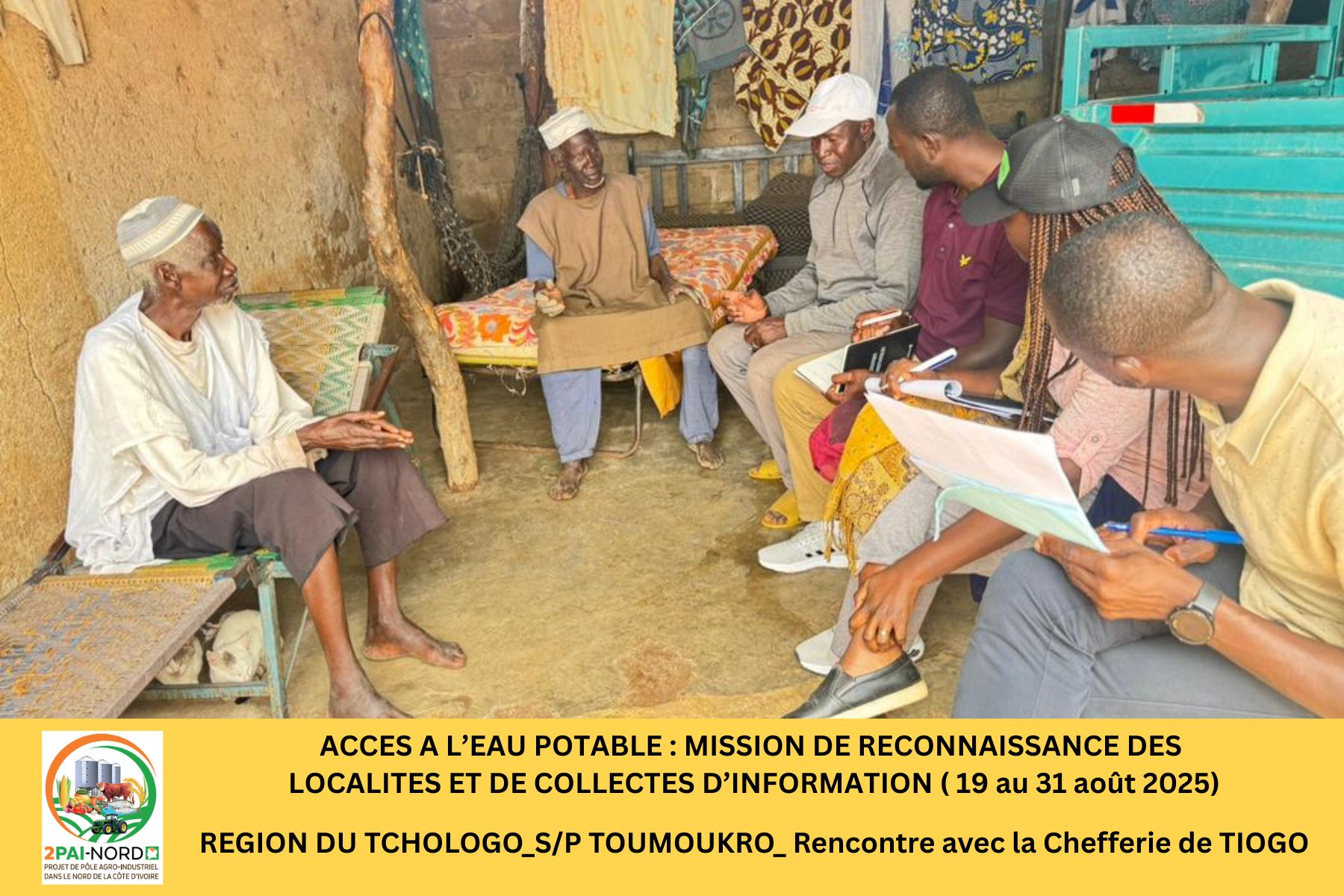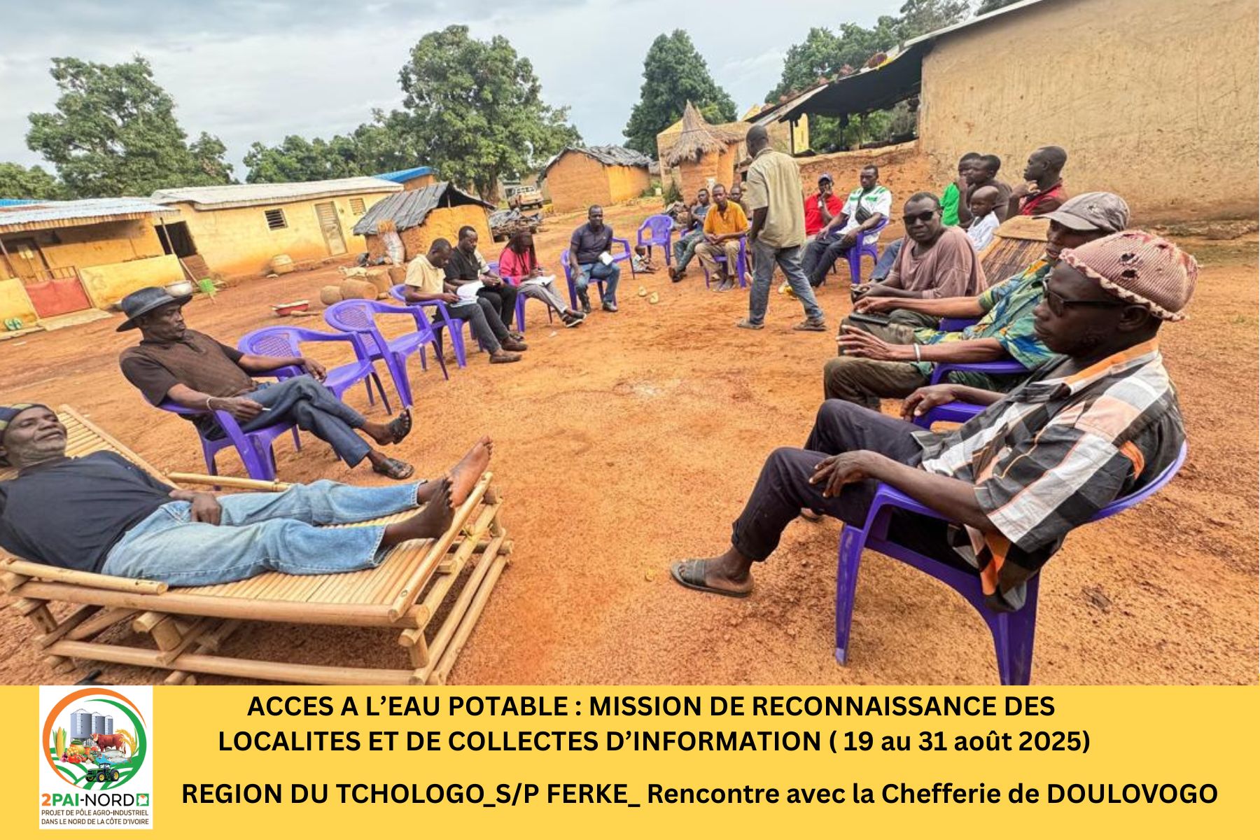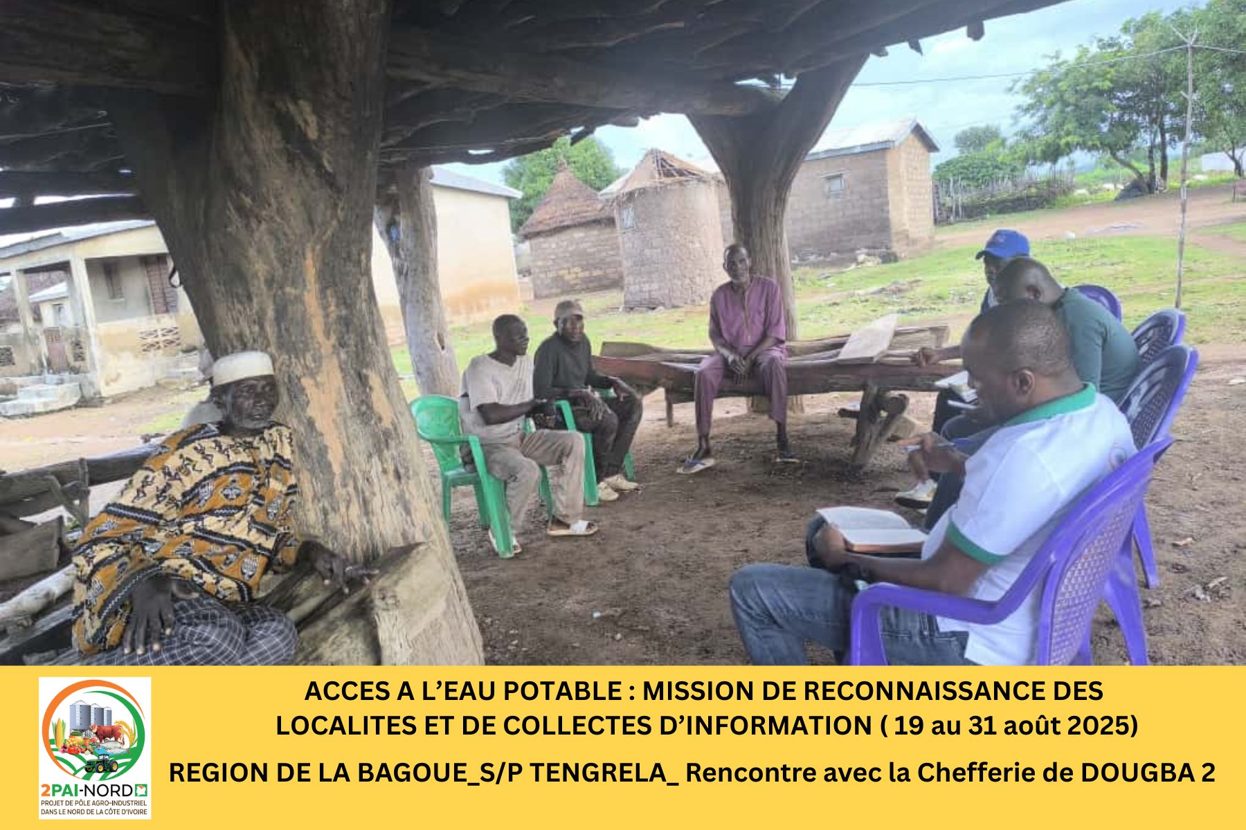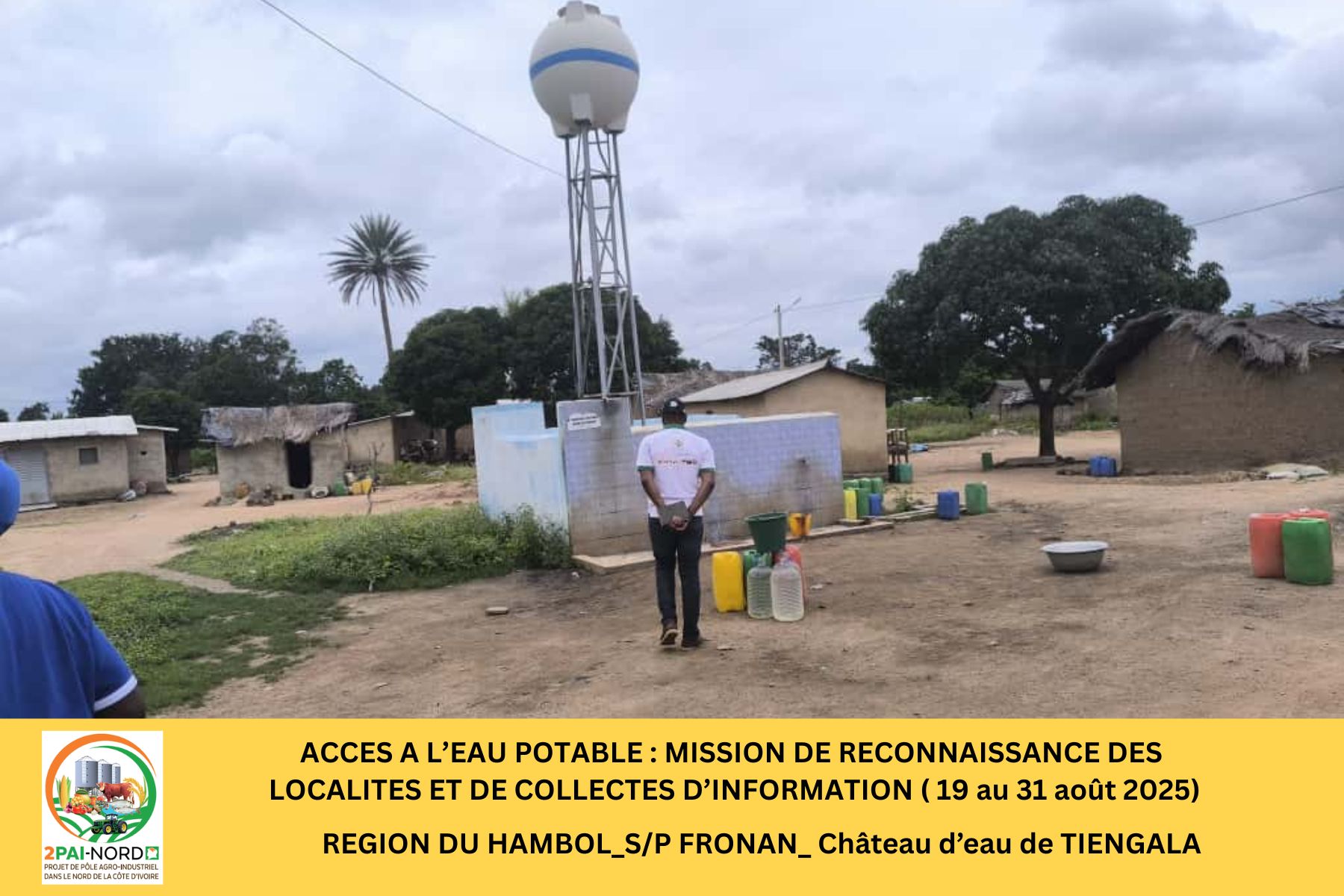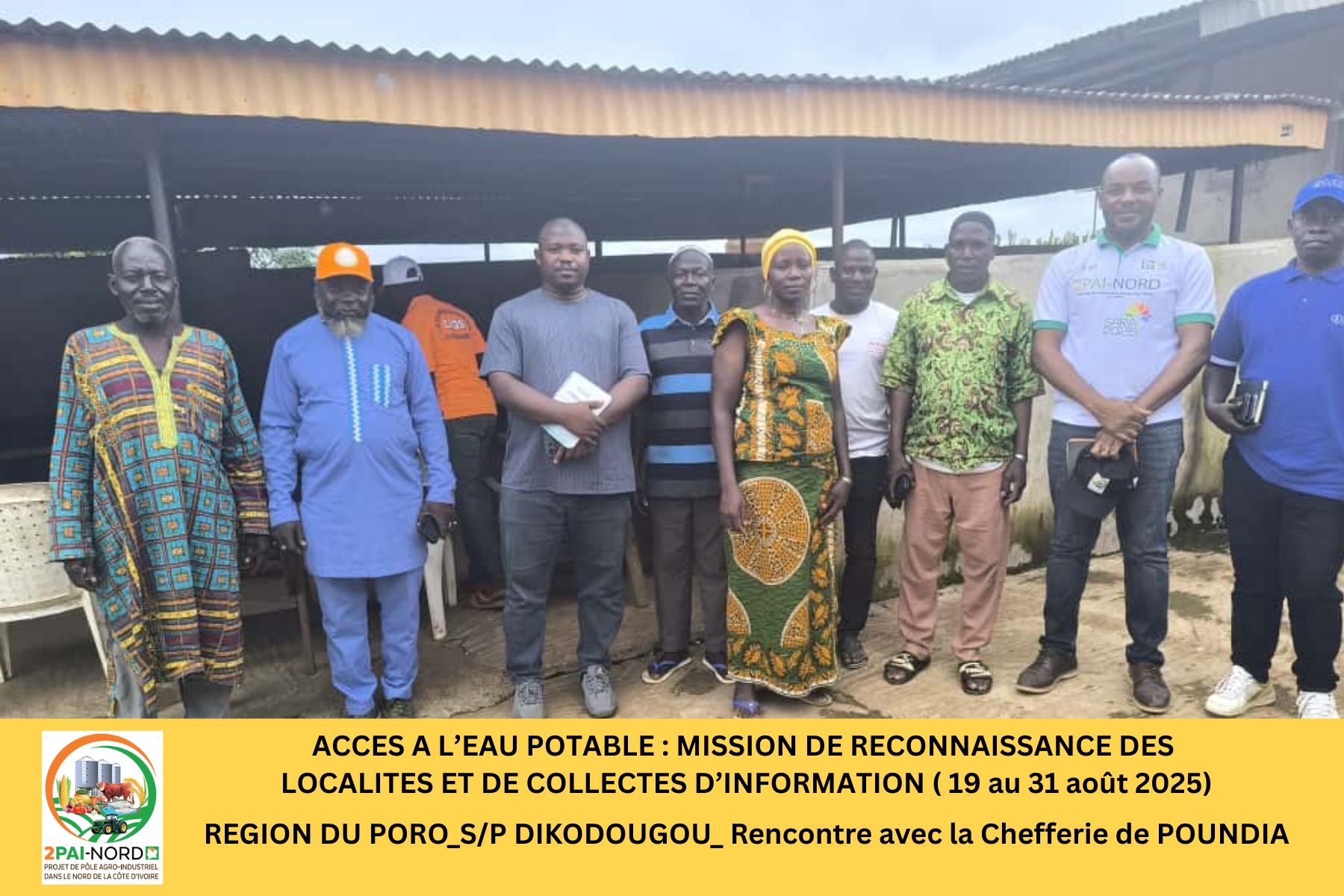 C’est dans cette perspective qu’une mission conjointe du Projet de Pôle Agro-Industriel dans le Nord (2PAI-NORD)et de l’Office National de l’Eau Potable (ONEP), conduite par Monsieur DIBI Hyacinthe, Ingénieur en Génie Civil, s’est déroulée du 19 au 31 août 2025. Cette mission a couvert cinquante-deux (52) localités de la zone d’intervention du Projet. Elle avait pour objectif de diagnostiquer la situation de l’accès à l’eau potable dans les localités présélectionnées et de préparer les études de faisabilité technique (Avant-Projet Sommaire/ Avant-Projet Détaillé), étape préalable à la réalisation des infrastructures.